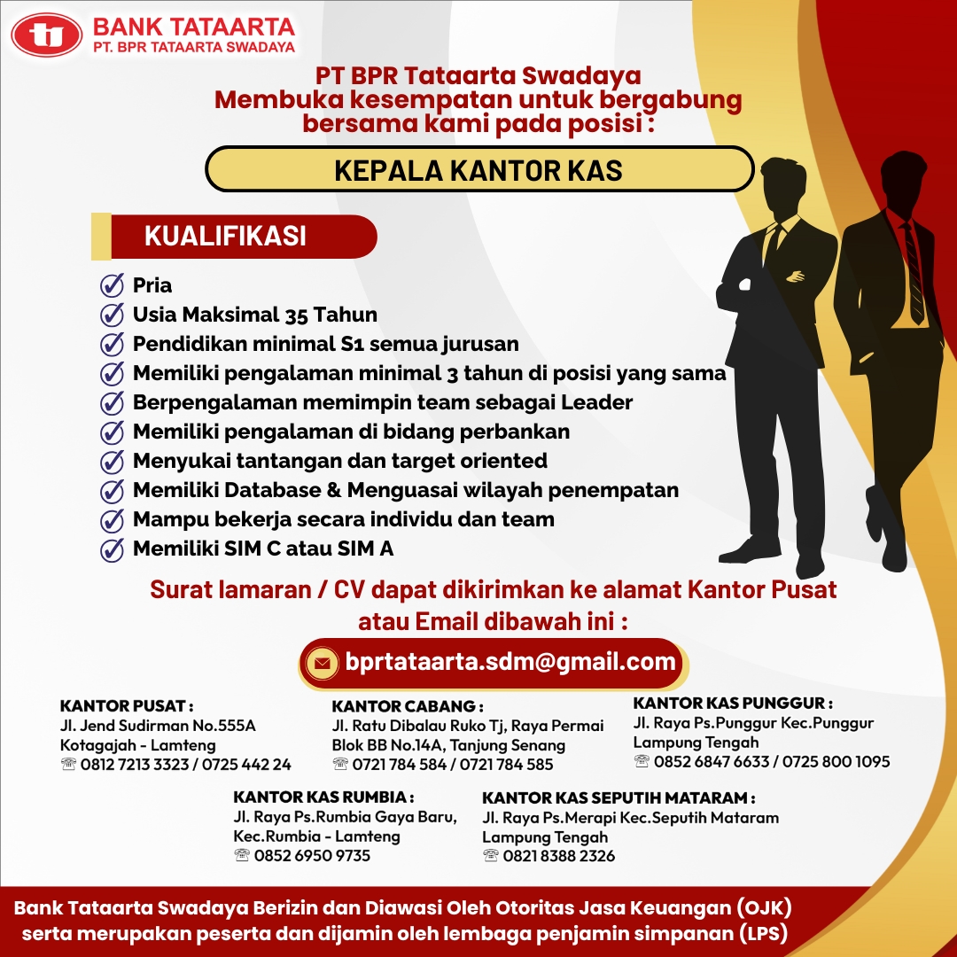 PENGUMUMAN Pindah alamat kantor PT.BPR Tataarta Swadaya (Kas Punggur) Kami informasikan kepada seluruh Nasabah, Mitra/Relasi Bisnis, beserta seluruh lapisan